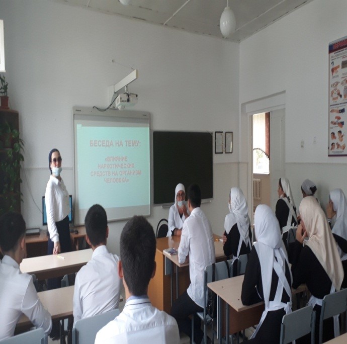 15.09.202015 сентября зам. дир по ВР Исраиловой М.З., совместно с психологом школы Хизриевой А.А., школьной медсестрой Муцуевой Т.Ч был проведен семинар на тему: «Влияние наркотических и психотропных веществ на организм человека» среди обучающихся 10-х классов. В ходе беседы Муцуева Т.Ч объяснила разницу между понятиями «наркотики» и «психоактивные вещества». Здесь же они рассказа детям о неблагоприятных последствиях, от которых страдают люди, употребляя токсические вещества, табак, алкоголь, наркотики.