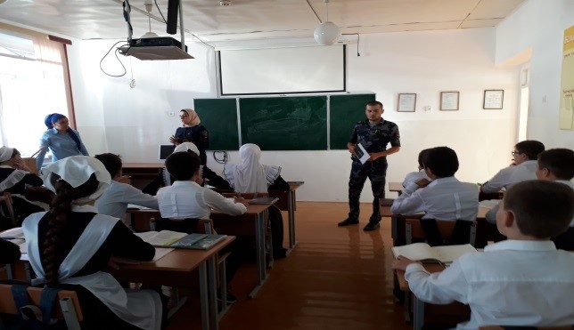 Также старшим инспектором ПДН ОМВД России по Грозненскому району старшим лейтенантом полиции Исраиловым И.Ш. В ходе встречи имам села подробно остановился на недопустимости совершения учениками преступлений и административных правонарушений, разъяснил права и обязанности несовершеннолетних, ответственность за свои поступки. Школьникам было разъяснено, с каких лет наступает уголовная и административная ответственность и какие наказания применяются за совершение преступлений. Учащимся напомнили о вреде употребления ПАВ, а также объяснили, чем они опасны. Также была затронута и тема антитеррористической направленности. Инспектор по делам несовершеннолетних настоятельно рекомендовал соблюдать правила безопасности на улице, в общественных местах и местах массового отдыха. Ребята с большим вниманием слушали инспектора, задавали вопросы, на которые получали компетентные ответы.