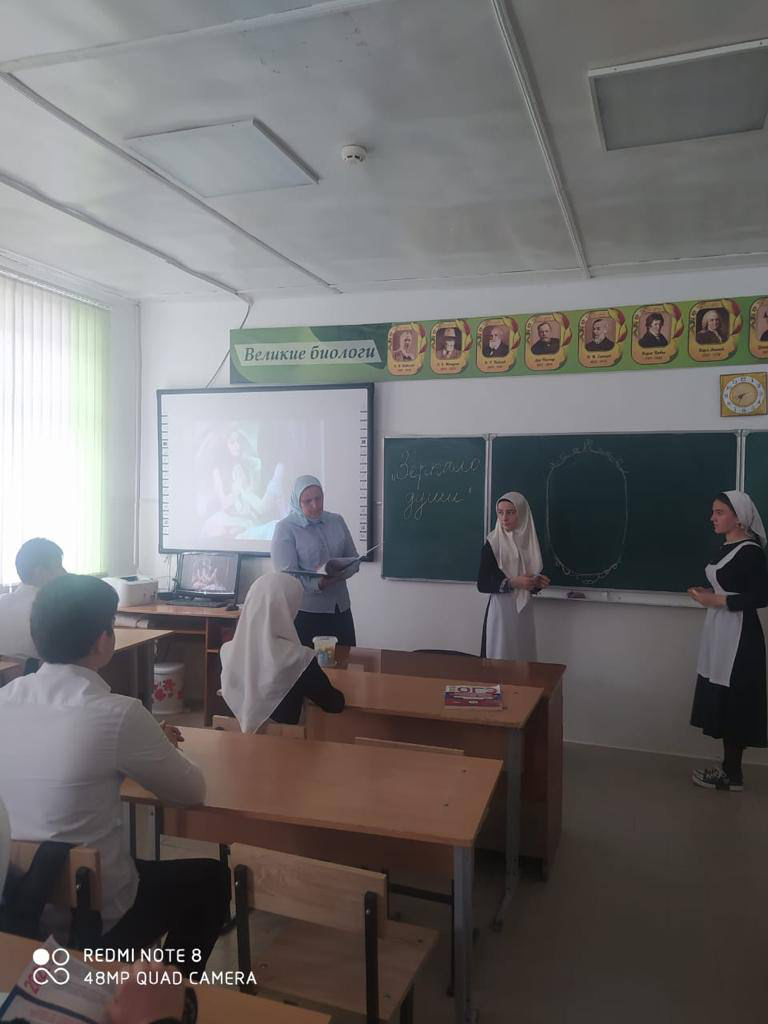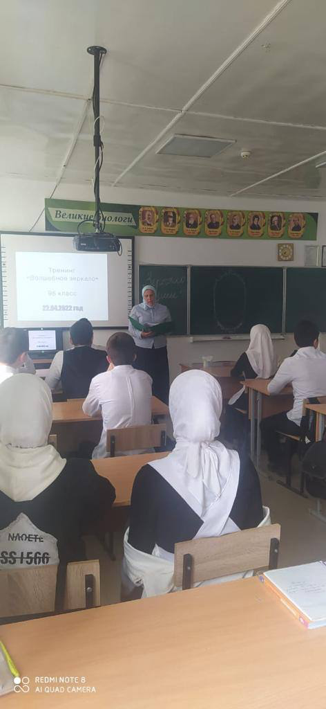 МБОУ «СОШ с.Беркат-Юрт» 20.04.2022г. В рамках проведения Недели психологии классным руководителем Джамалуевой А.У. проведен тренинг «Волшебное зеркало» среди обучающихся 9 класса. Занятие посвящено формированию мотивации и навыкам постановки жизненных целей.
