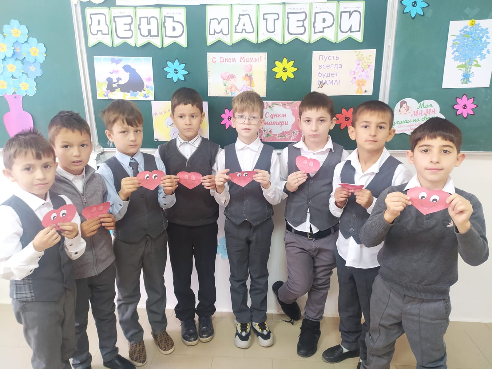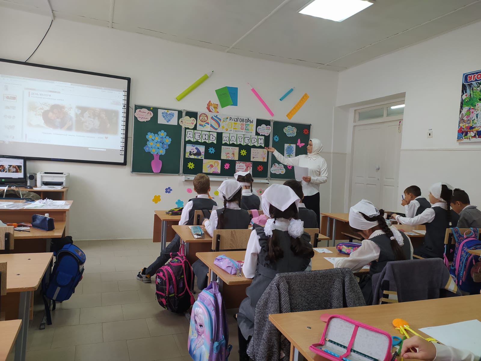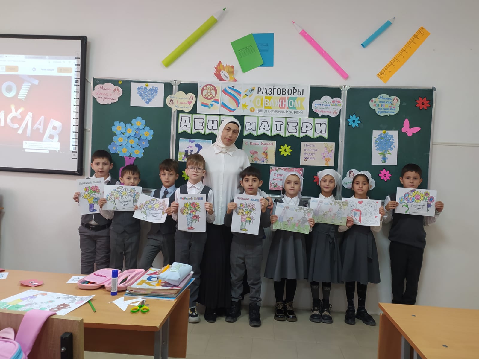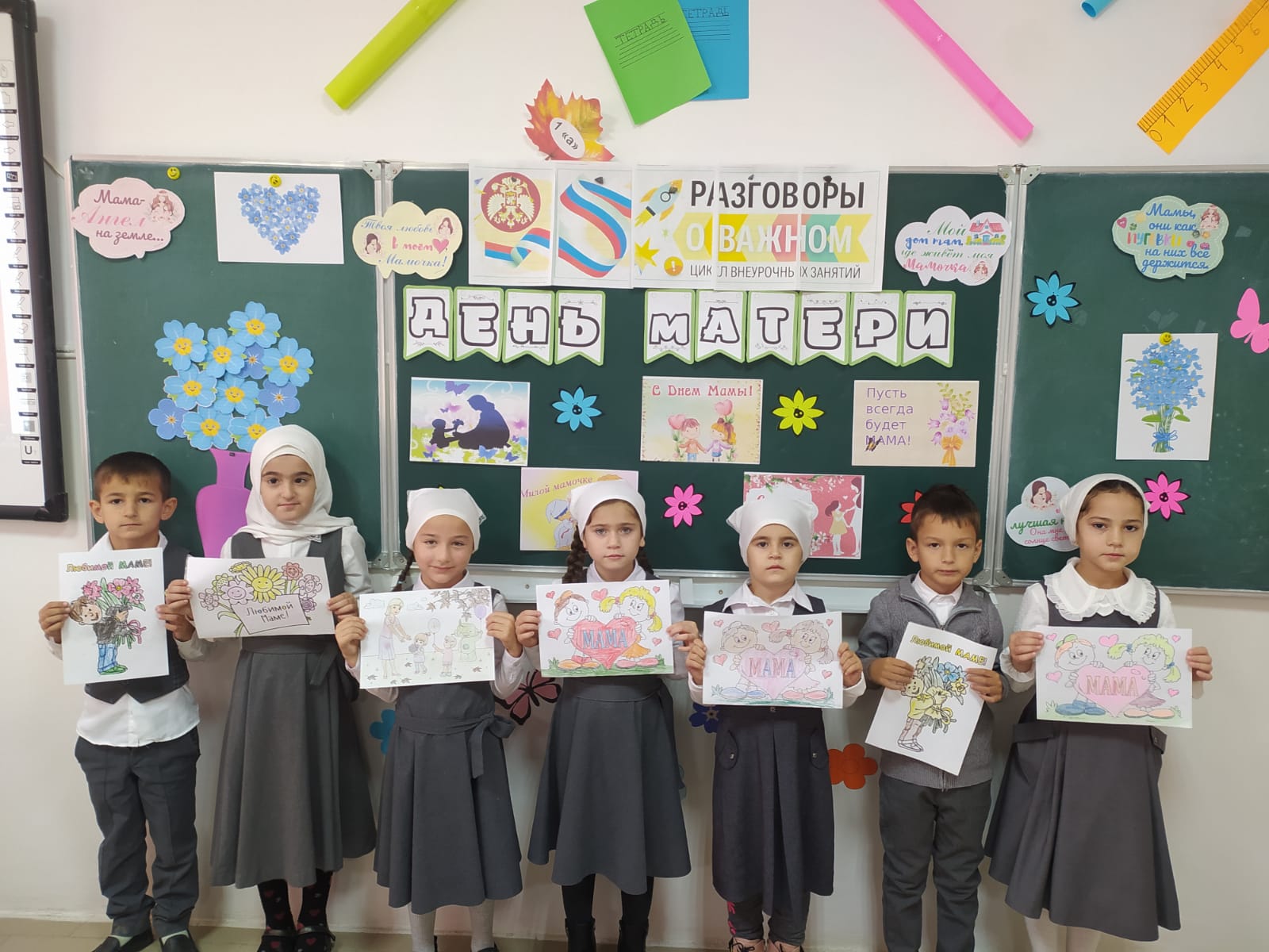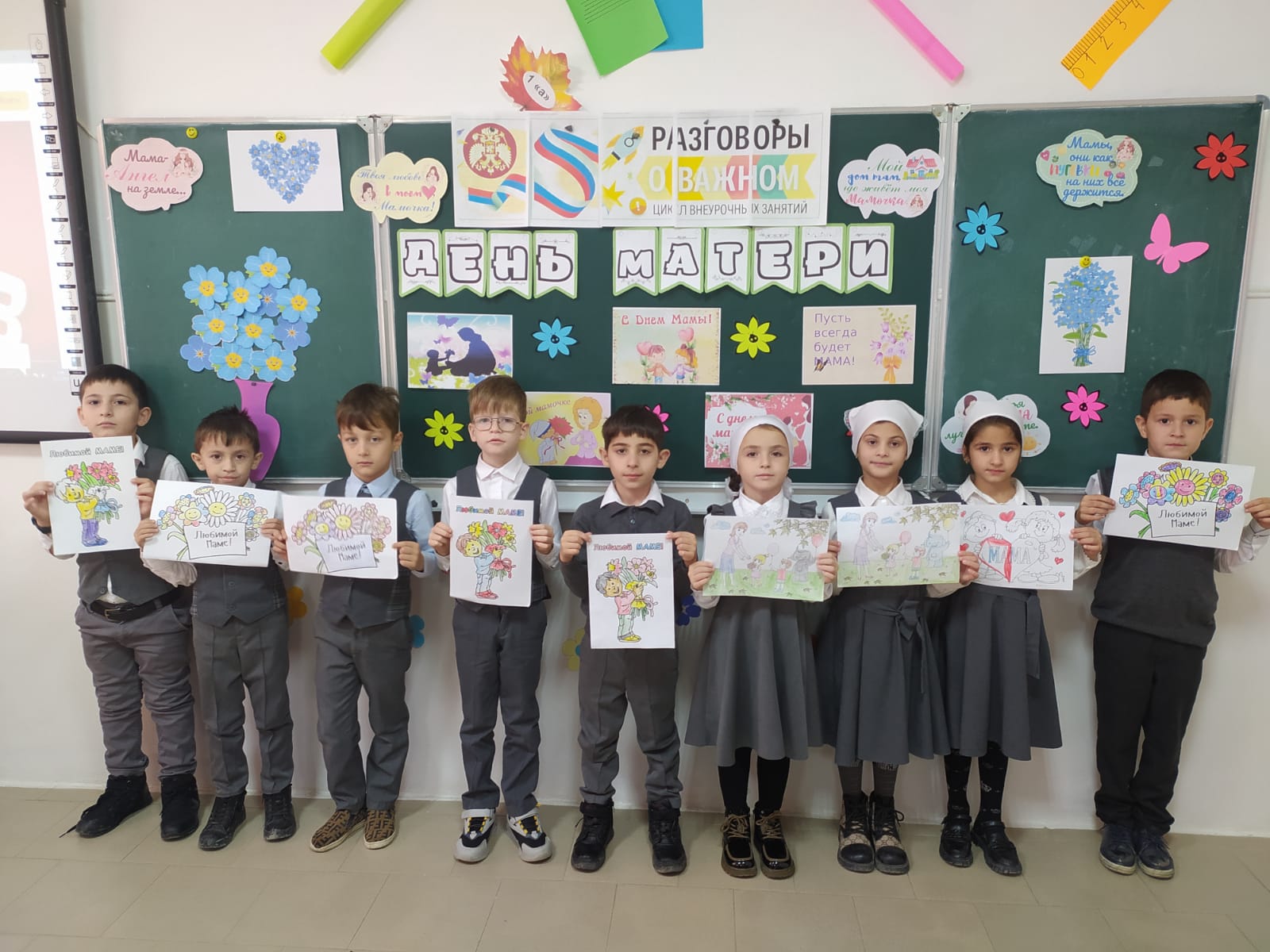 В МБОУ СОШ с.Беркат-Юрт классный руководитель 1" А" класса Хизриева Петимат Алиевна провела урок Разговор о важном на тему "День Матери".