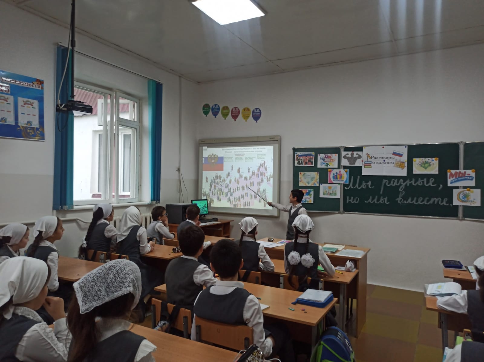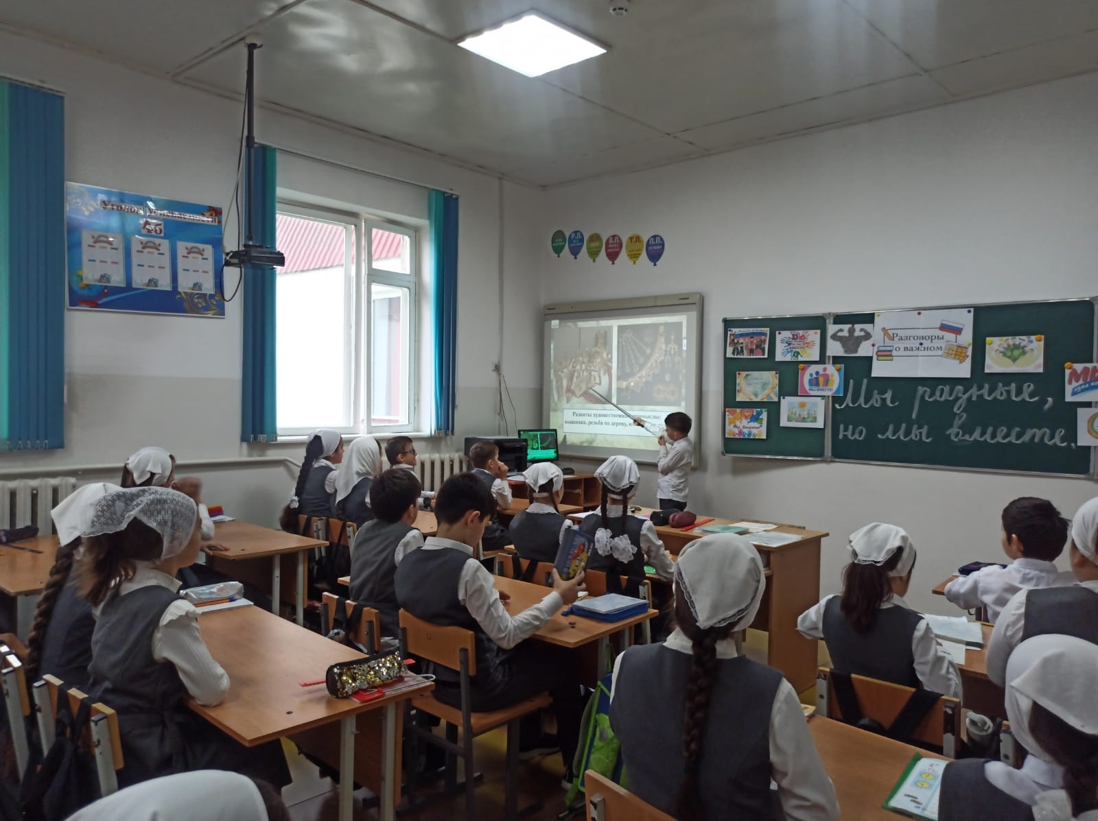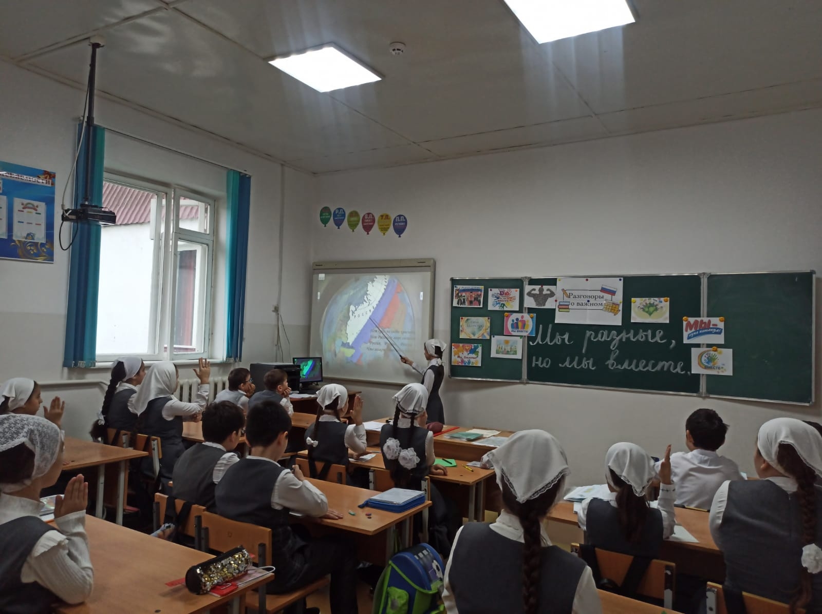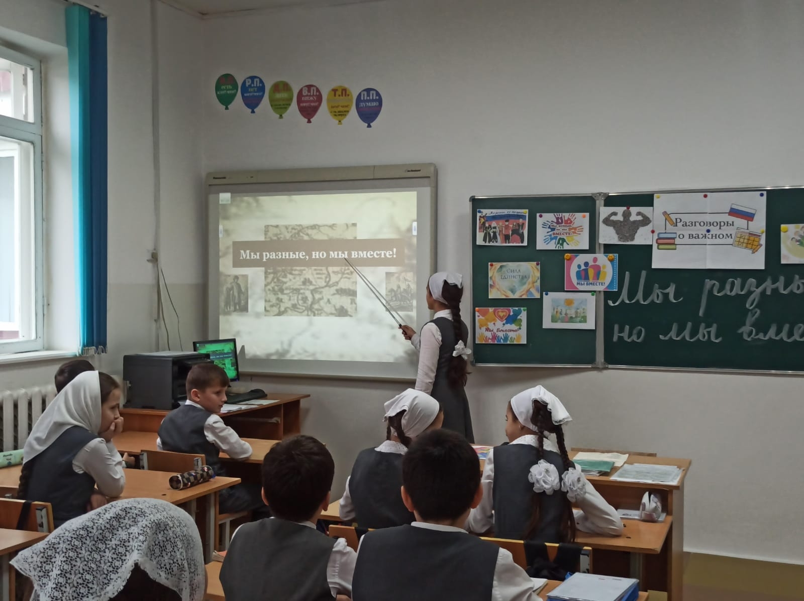 В МБОУ СОШ с.Беркат-Юрт классный руководитель " 4б" класса Елбазова Зарема Ширваниевна провела урок Разговор о важном на тему "Мы разные, но мы вместе"
