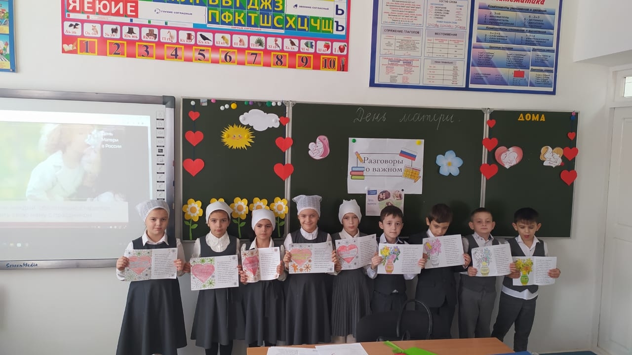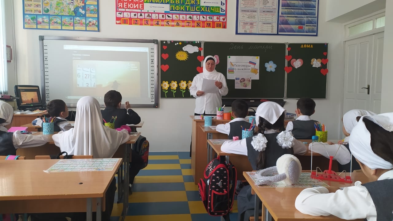 В МБОУ СОШ с.Беркат-Юрт классный руководитель "1 б" класс, учитель Мусханова А. А-Г. провела урок Разговор о важном на тему "День матери"