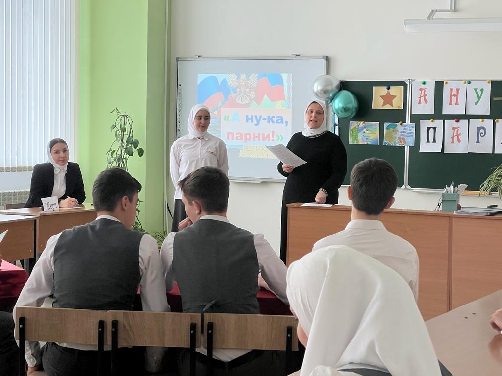 В МБОУ СОШ с.Беркат-Юрт педагог Джамалуева Аминат Усамовна провела конкурс среди учащихся 10-х классов "А ну-ка парни" приуроченный ко Дню защитника Отечества