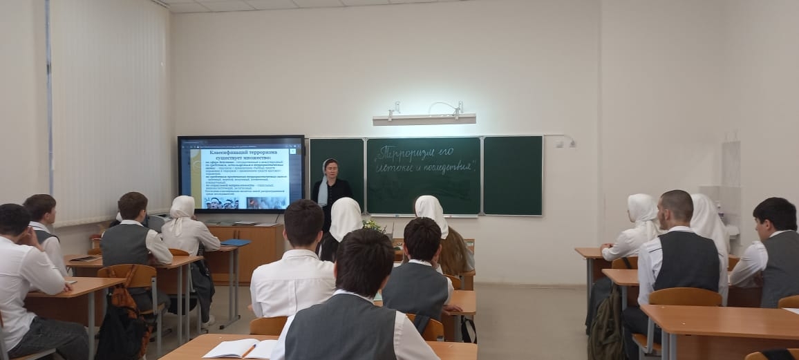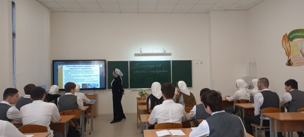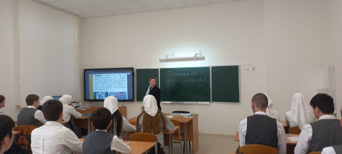 16.03.2023 года в МБОУ «СОШ с.Беркат-Юрт Грозненского муниципального района» ЧР учителем обществознания Тимиргириевой Л.Х была проведена беседа с учащимися 9г класса на тему: «Терроризм ее истоки и последствия»,