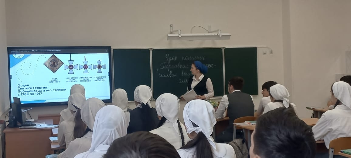 4 мая 2023 года в МБОУ «СОШ с.Беркат-Юрт» прошёл Всероссийский Урок памяти «Георгиевская ленточка – символ воинской славы», на котором рассказали об истории появления и становления символа воинской славы – Георгиевской ленте, и её роли в обществе, как в прошлом, так и в настоящем. О том, что она во все времена олицетворяла доблесть защитников нашего Отечества.