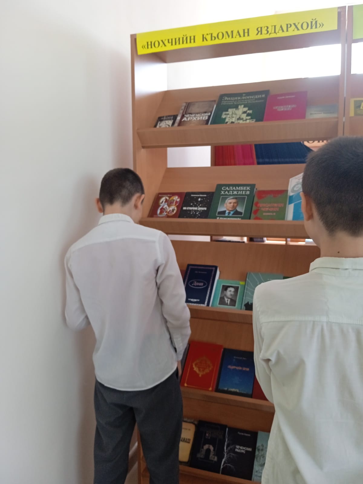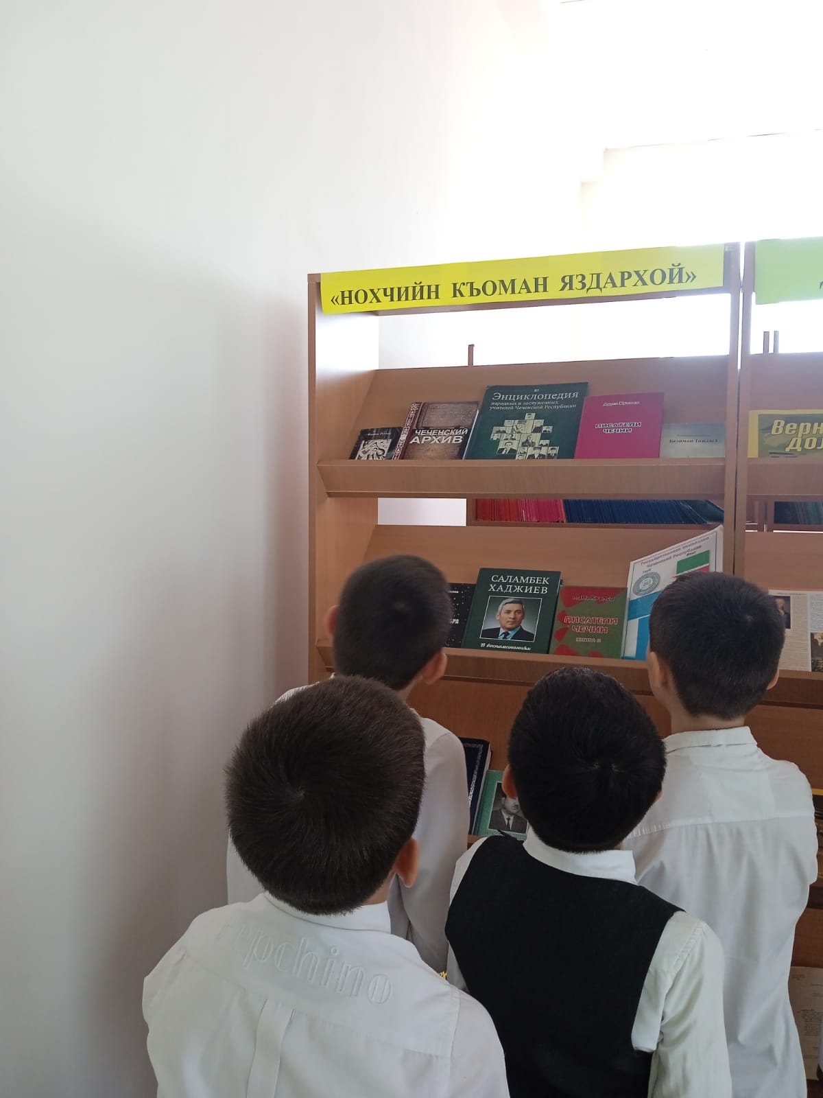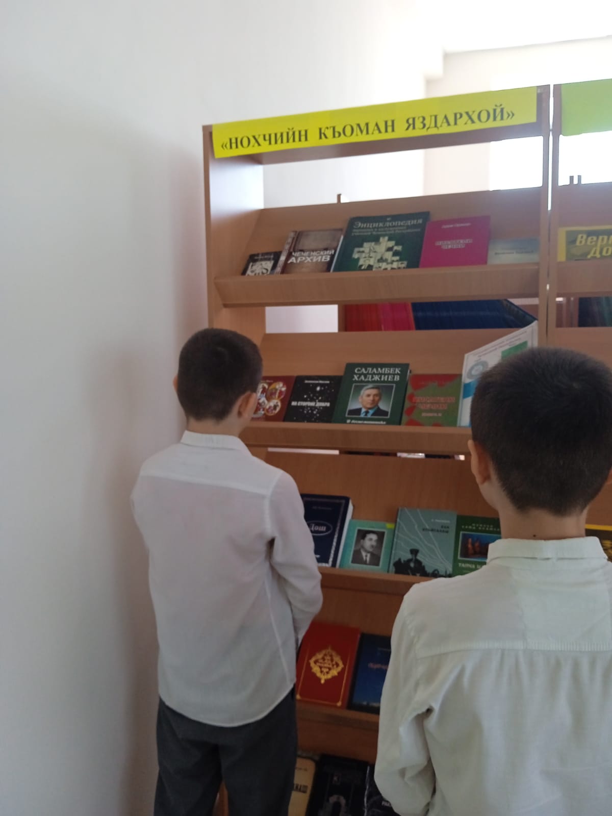 17 апреля в МБОУ СОШ с.Беркат-Юрт проведена выставка книг "Нохчийн къоман яздархой"