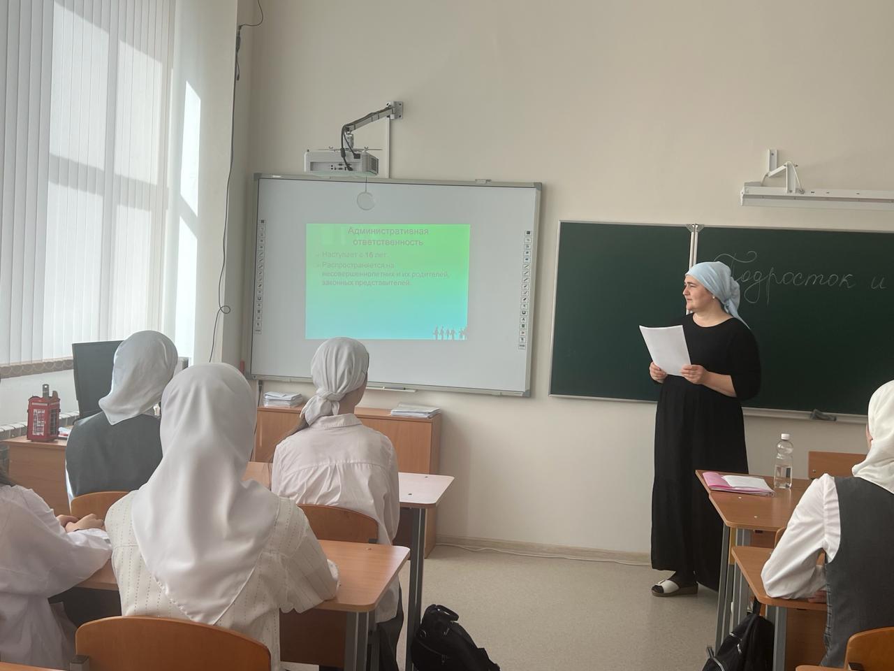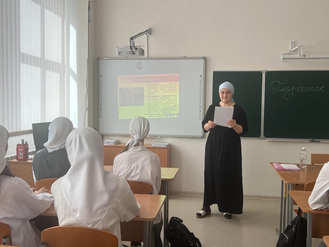 29.04.2024 в МБОУ "СОШ с.Беркат-Юрт" классный руководитель Абдулаева Х.Я. провела с обучающимися 8б класса лекторий на тему: «Подросток и Закон».