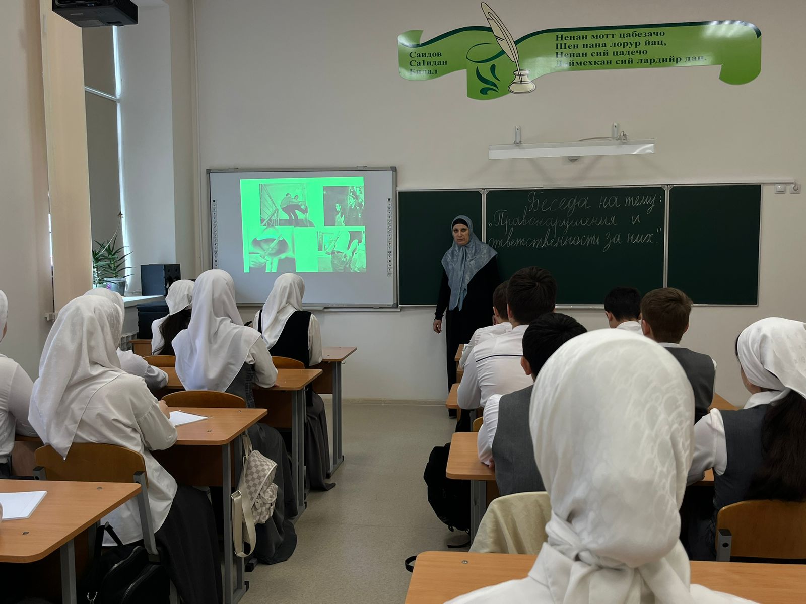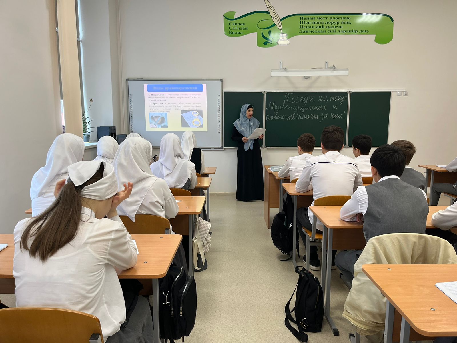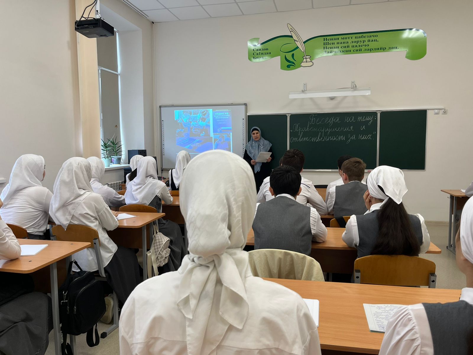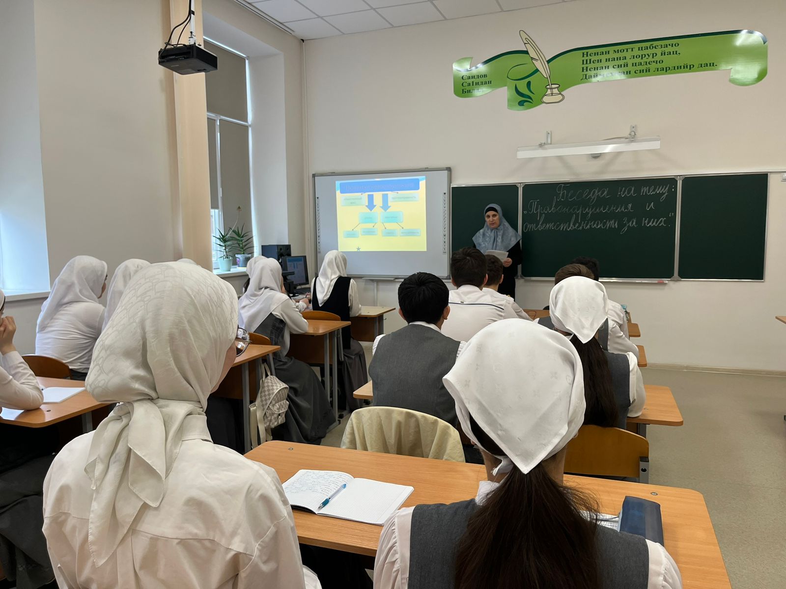 09.04.24 в МБОУ "СОШ с.Беркат-Юрт" классный руководитель Вакаева Т.С. провела классный час на тему: «Правонарушения и ответственность за них». с обучающихся 8а класса.
