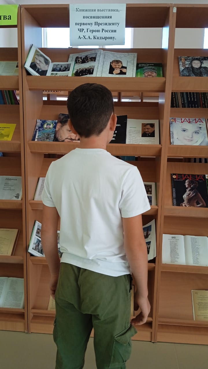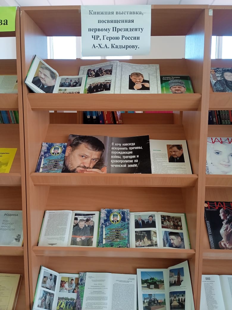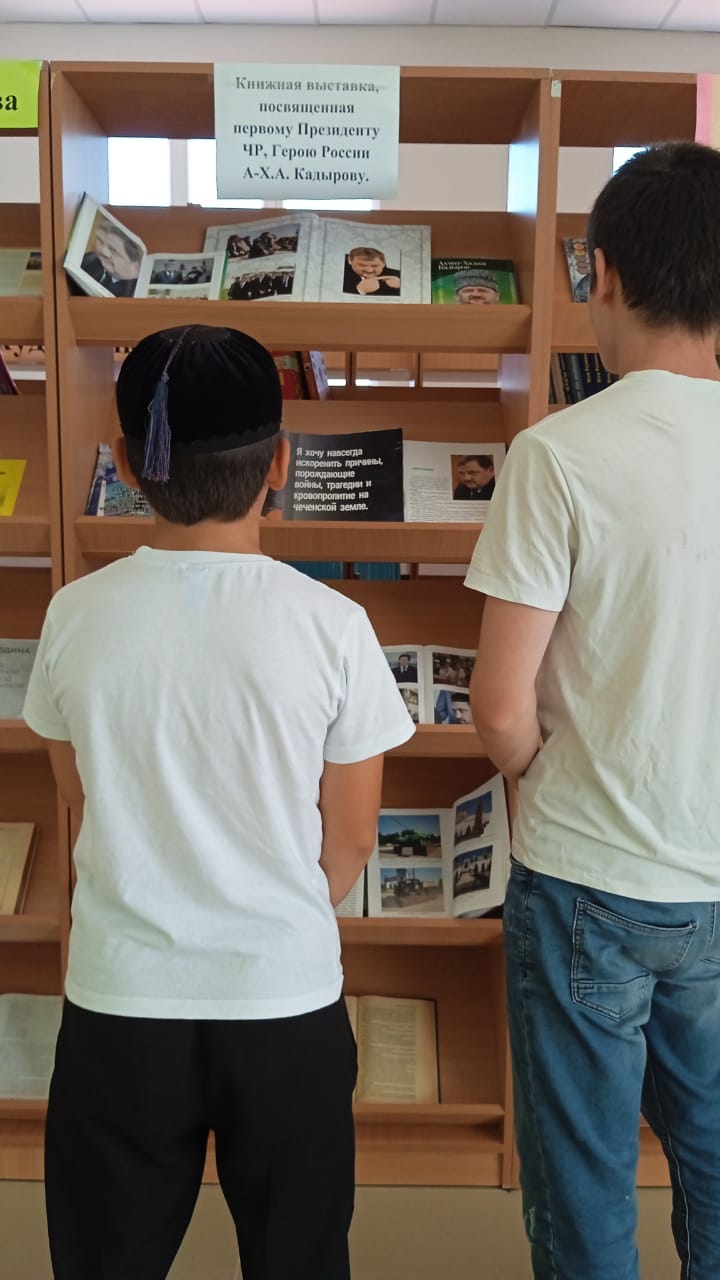 16 августа в МБОУ СОШ с.Беркат-Юрт проведена книжная выставка, посвящённая первому Президенту ЧР, Герою России А.-Х.Кадырову.
