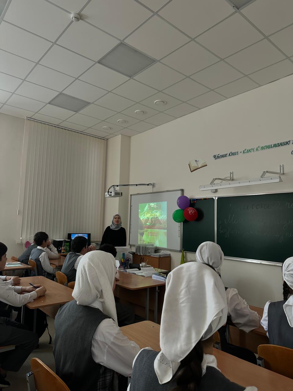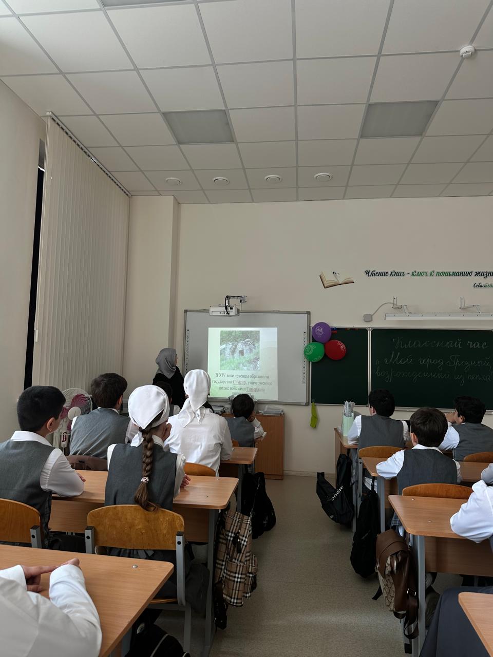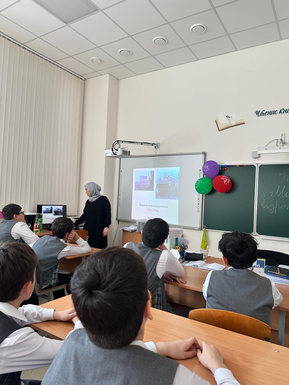 22 апреля в МБОУ «СОШ с.Беркат-Юрт» проведен классный час «Мой город-Грозный, возрожденный из пепла», приуроченный к Году Грозного и имени Владимира Владимировича Путина обучающимися 7-8 классов.