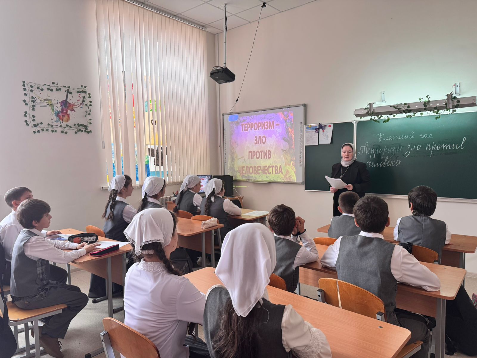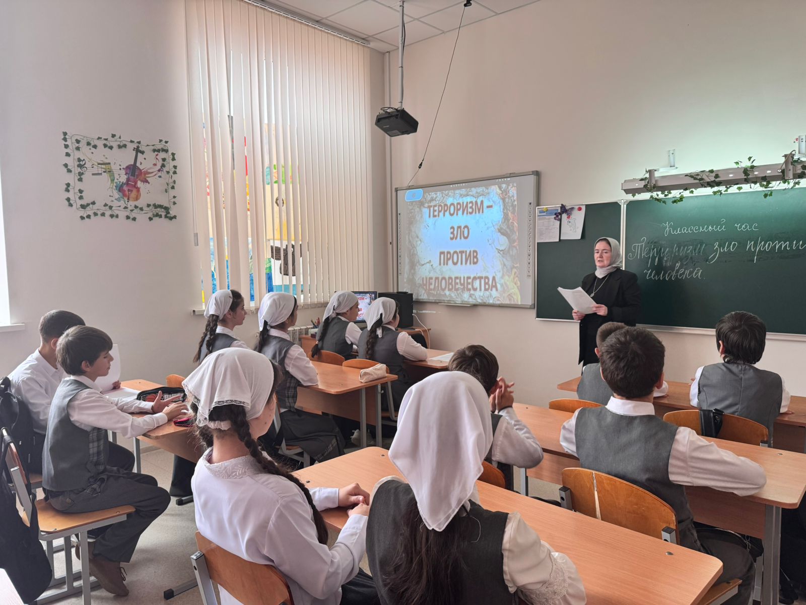 19.11.2025 с обучающимися 8 б классе проведен классный час на тему «Терроризм и экстремизм зло против человечества». С целью по недопущению проявления в молодежной среде таких негативных явлений как терроризм, экстремизм и ваххабизм.