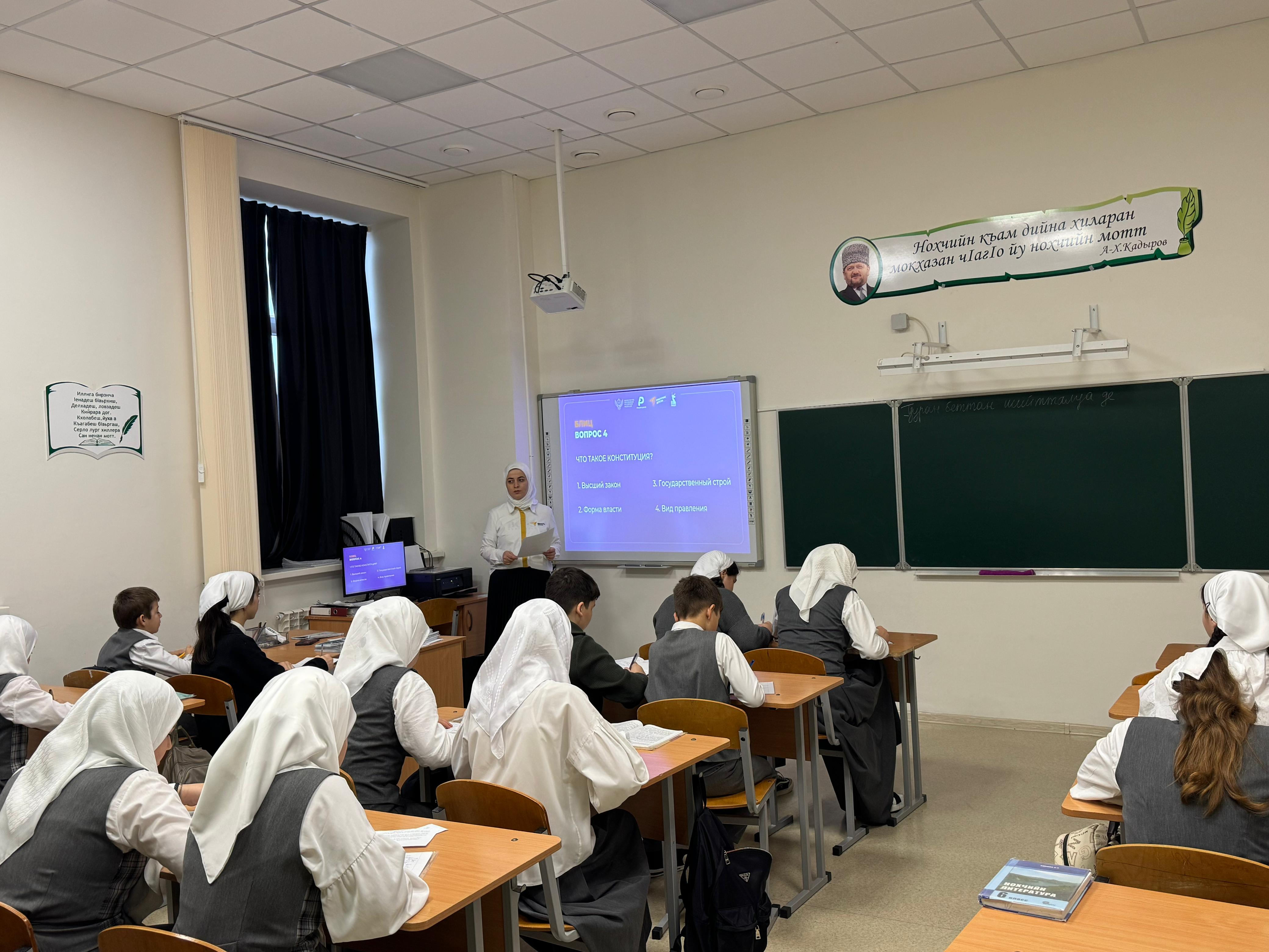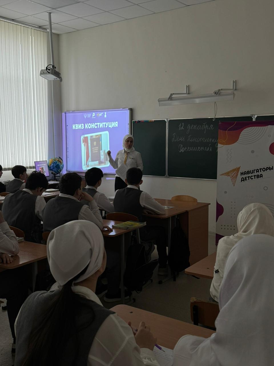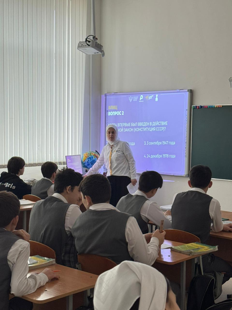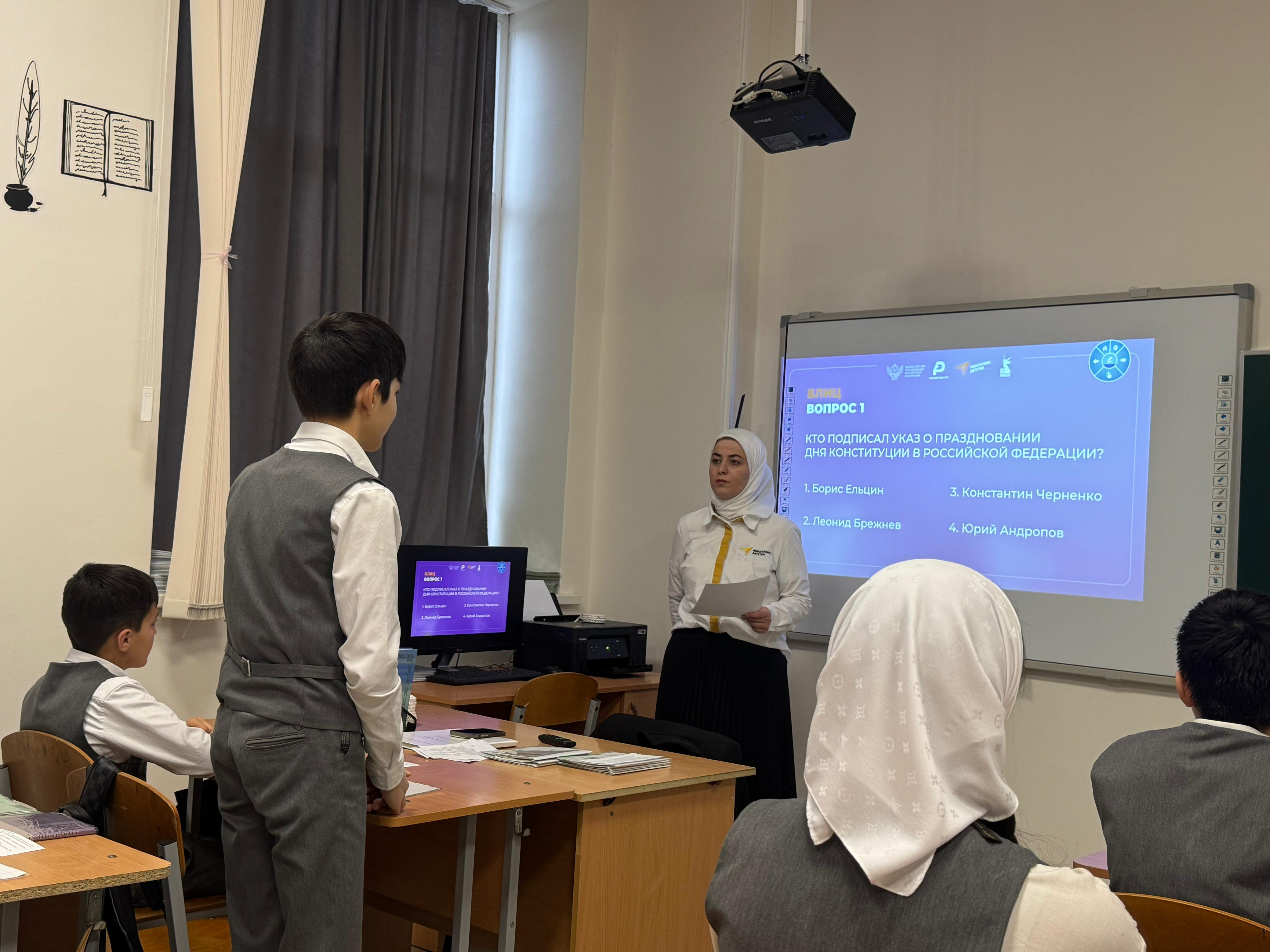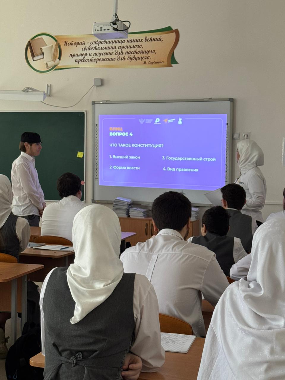 12 декабря Советник директора по воспитанию и взаимодействию с детскими общественными объединениями Эльмурзаева М.И для обучающихся 11 «А» класса провел интеллектуальную игру «Что мы знаем о конституции?», «Квиз конституция» посвященную Дню Конституции.