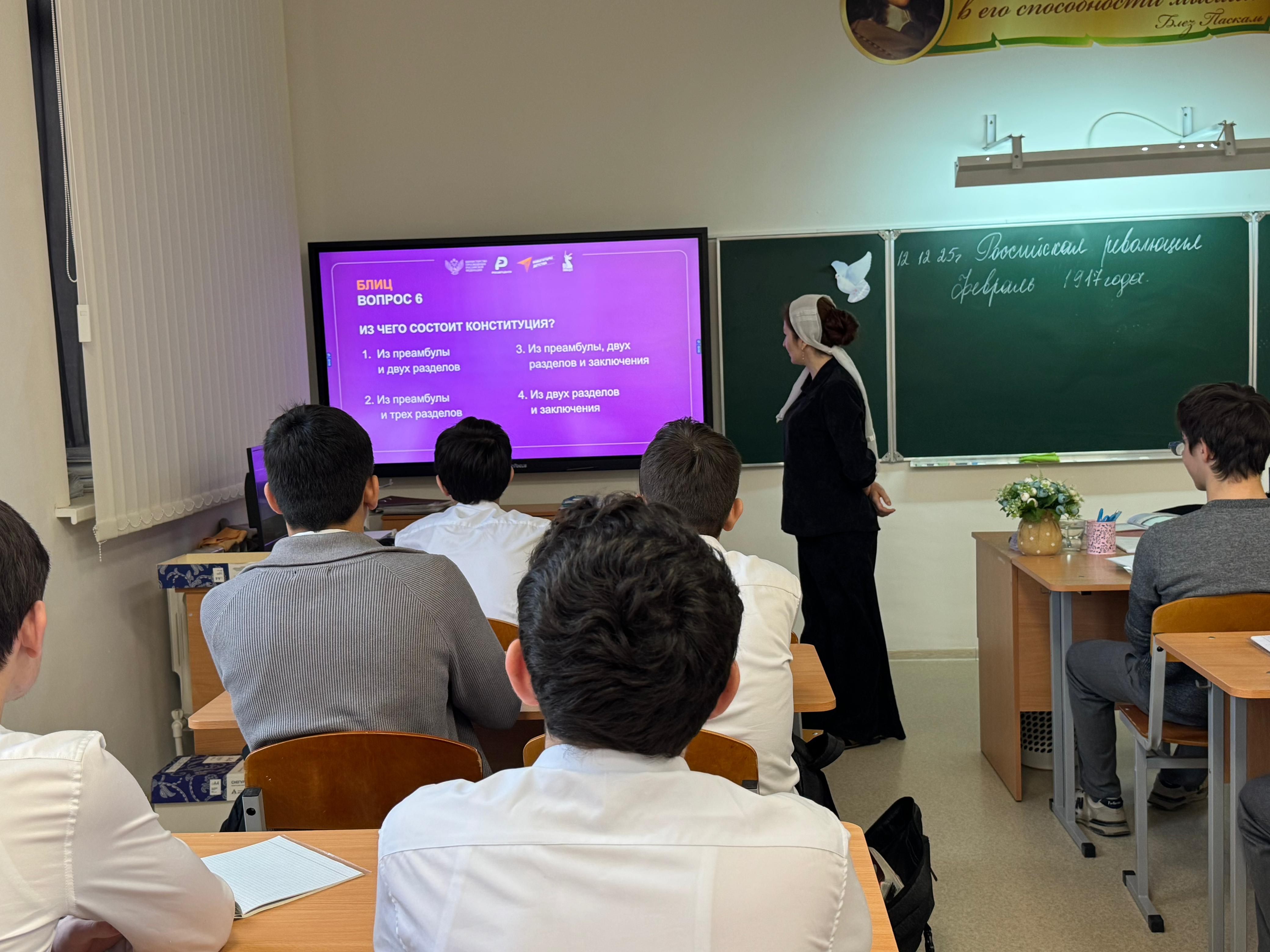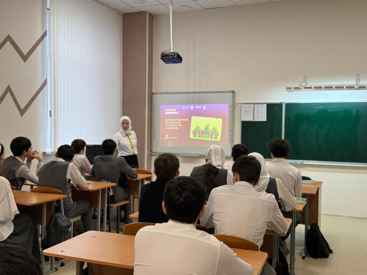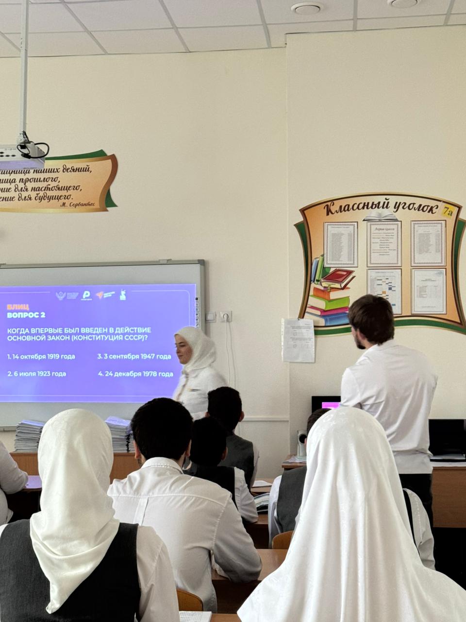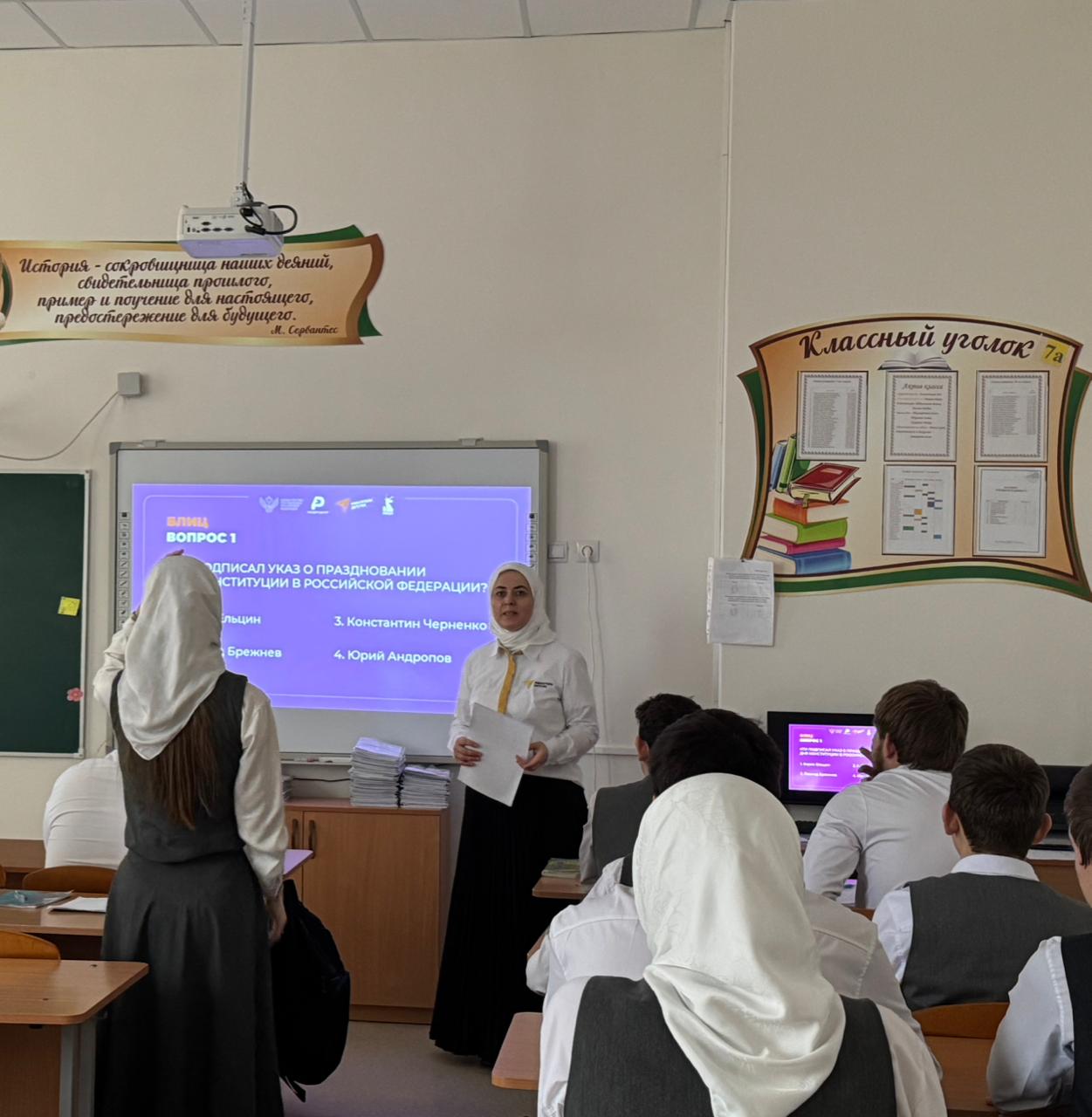 12 декабря Советник директора по воспитанию и взаимодействию с детскими общественными объединениями Эльмурзаева М.И для обучающихся 11 «А» класса провел интеллектуальную игру «Что мы знаем о конституции?», «Квиз конституция» посвященную Дню Конституции.