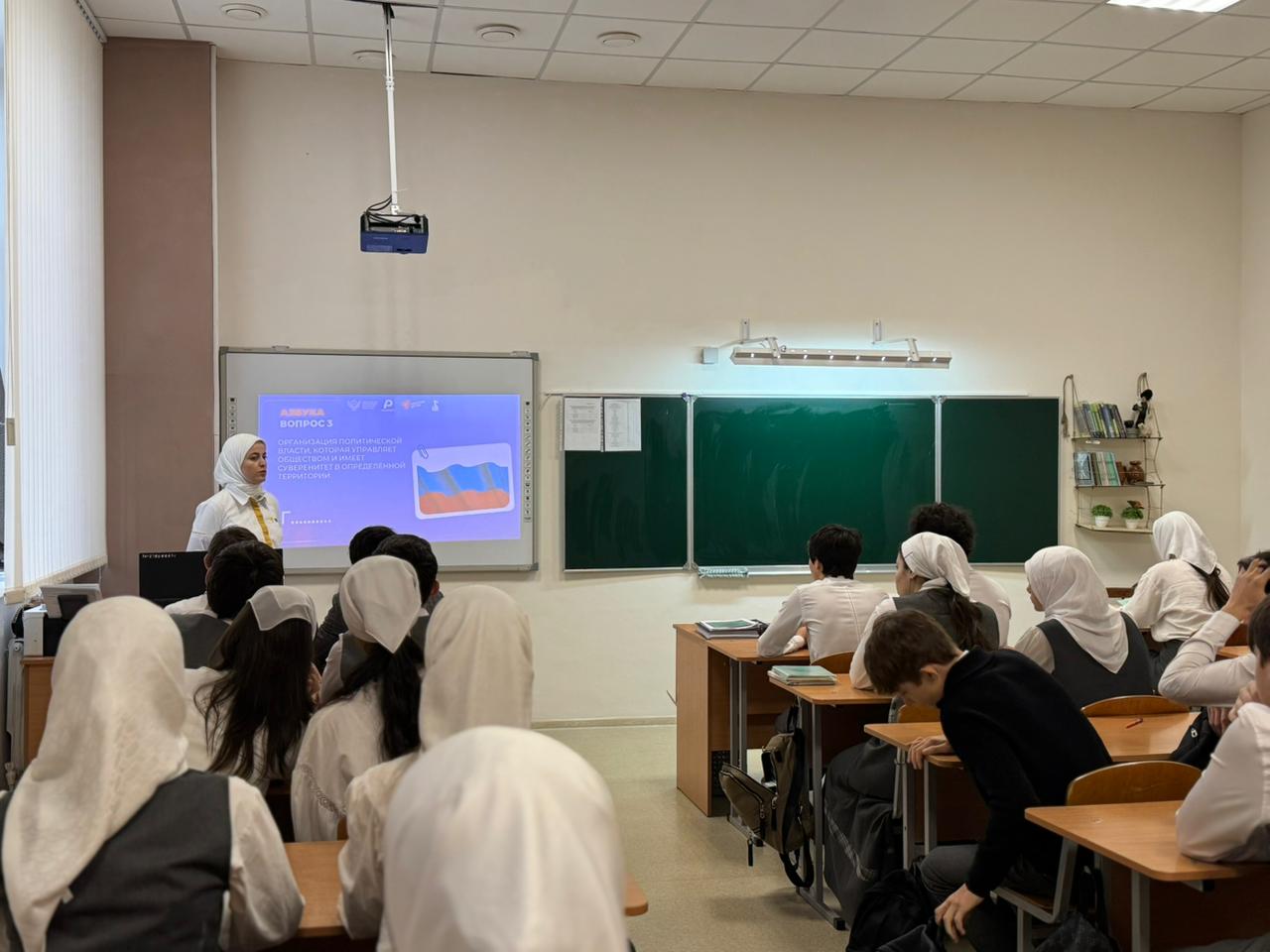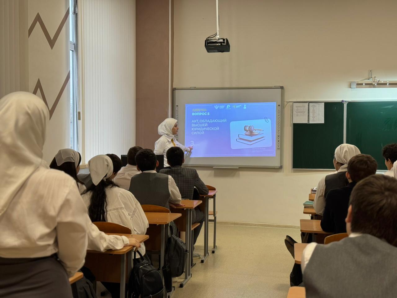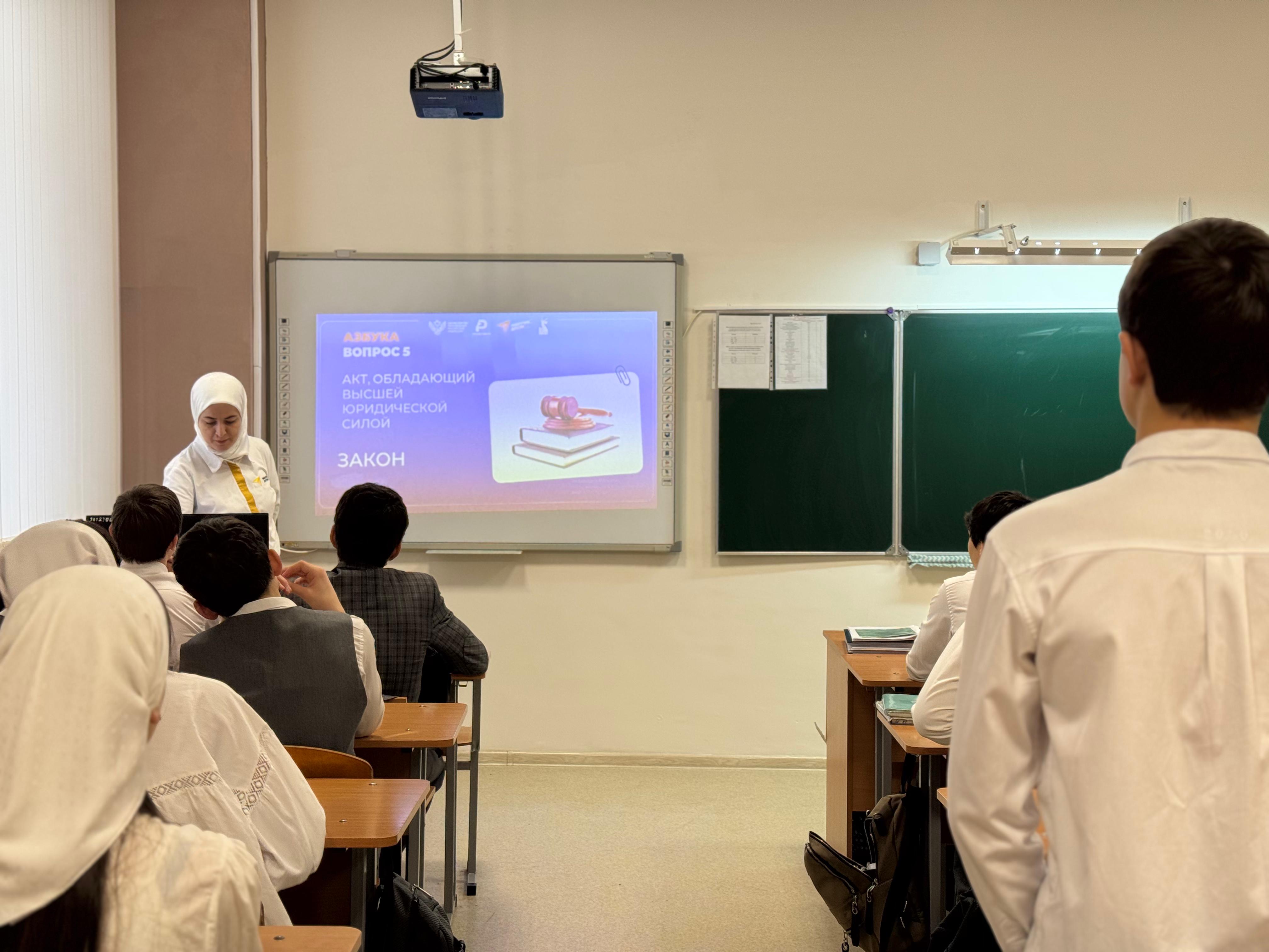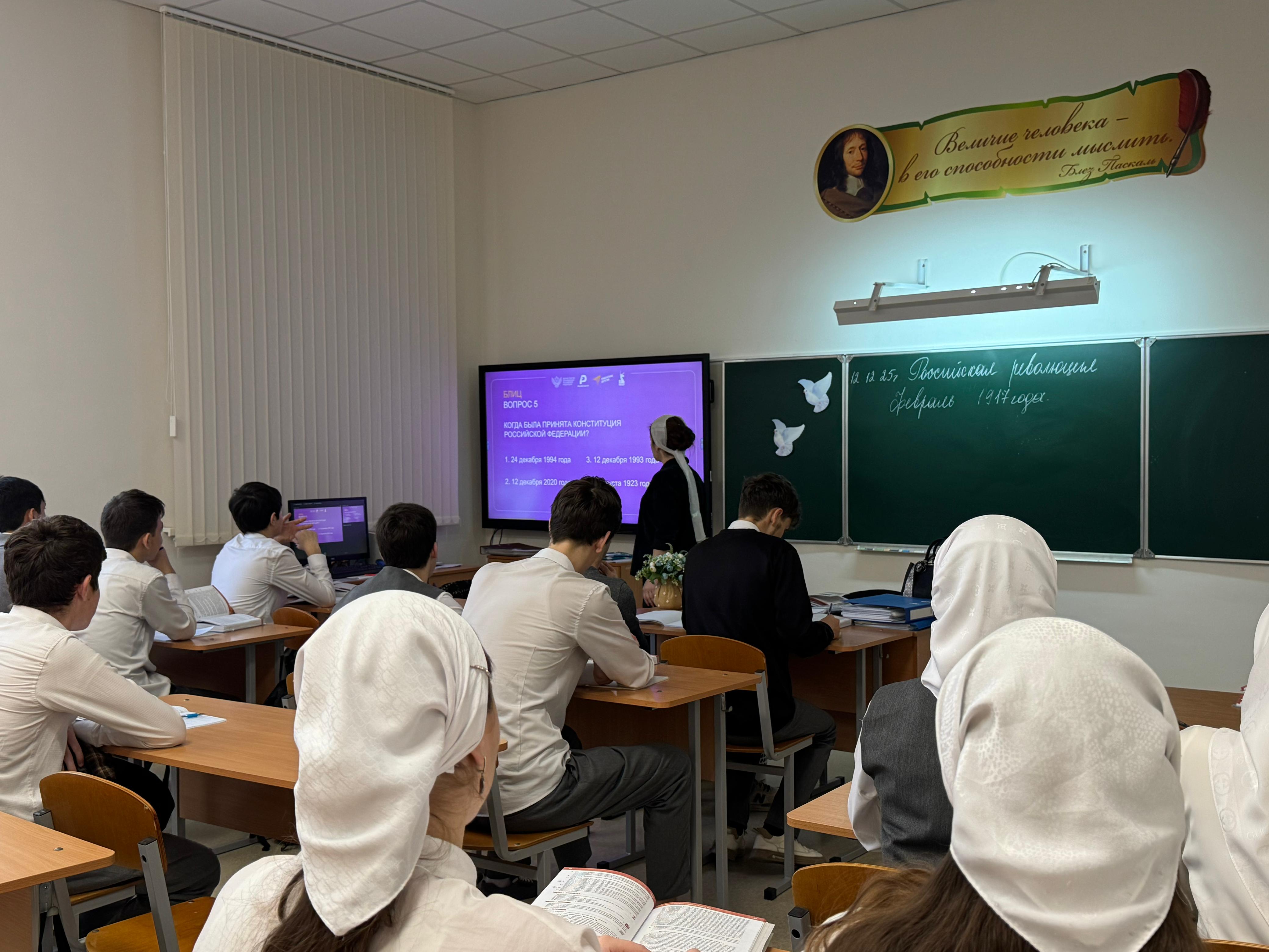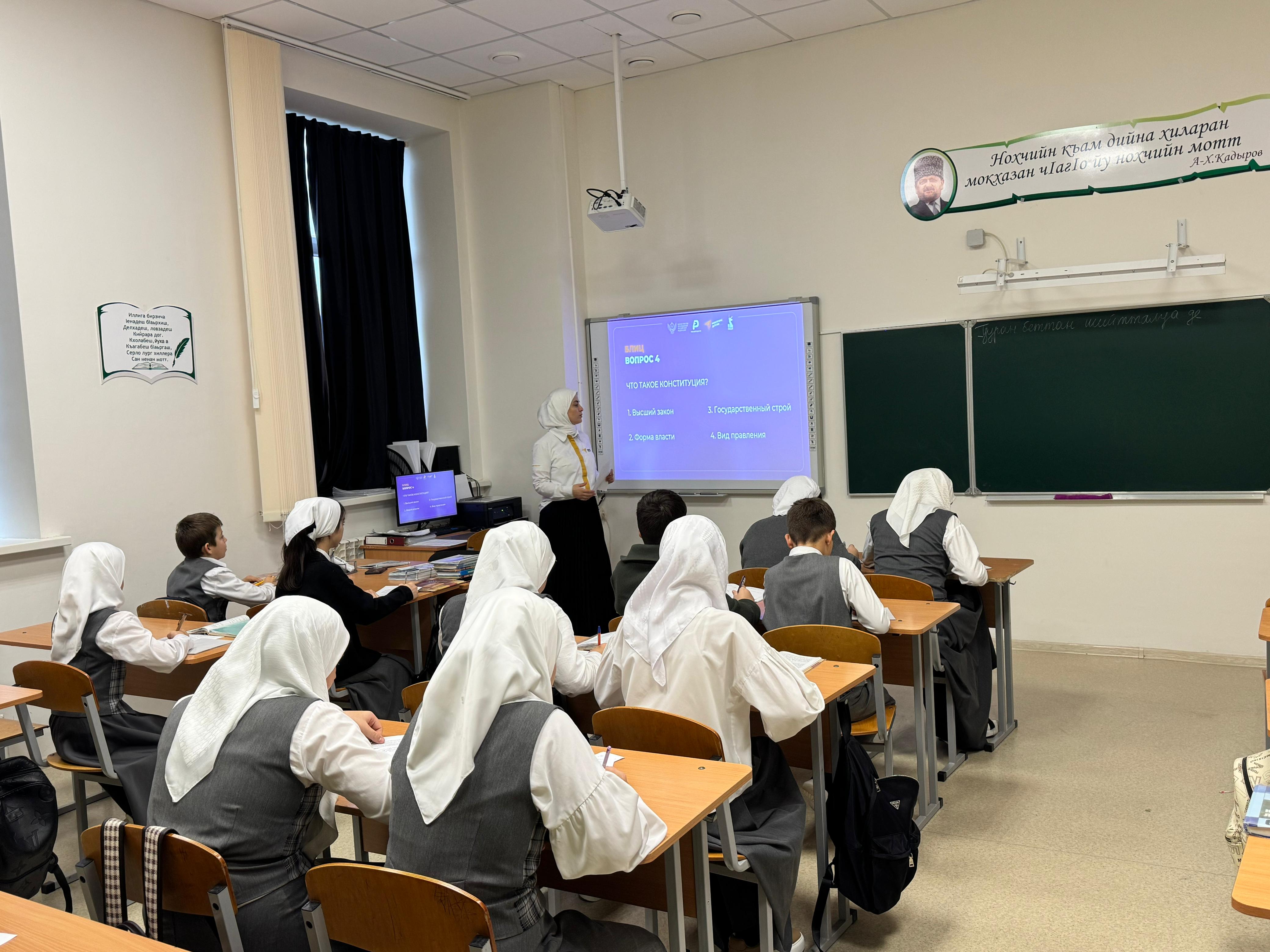 12 декабря Советник директора по воспитанию и взаимодействию с детскими общественными объединениями Эльмурзаева М.И для обучающихся 11 «А» класса провел интеллектуальную игру «Что мы знаем о конституции?», «Квиз конституция» посвященную Дню Конституции.