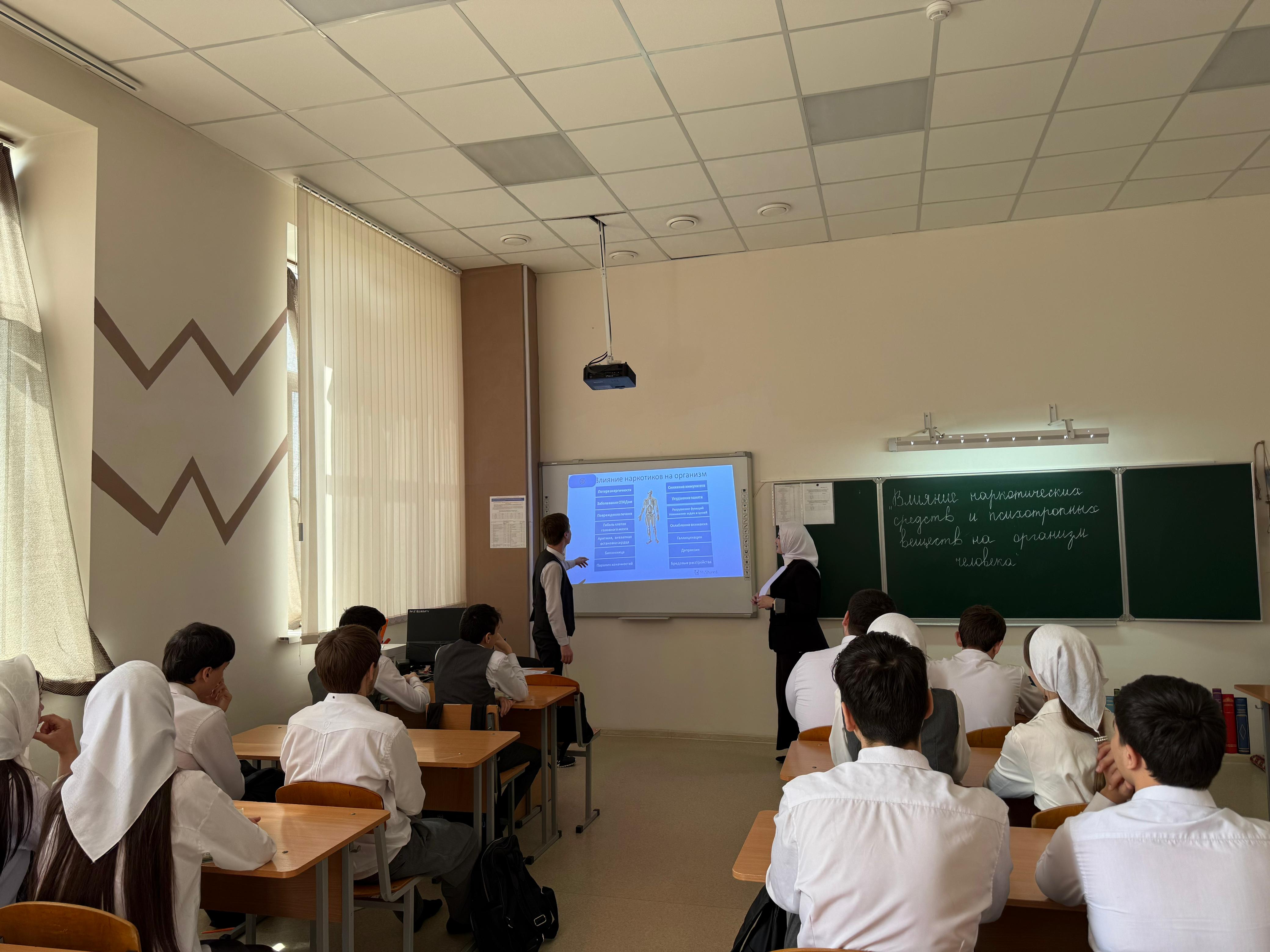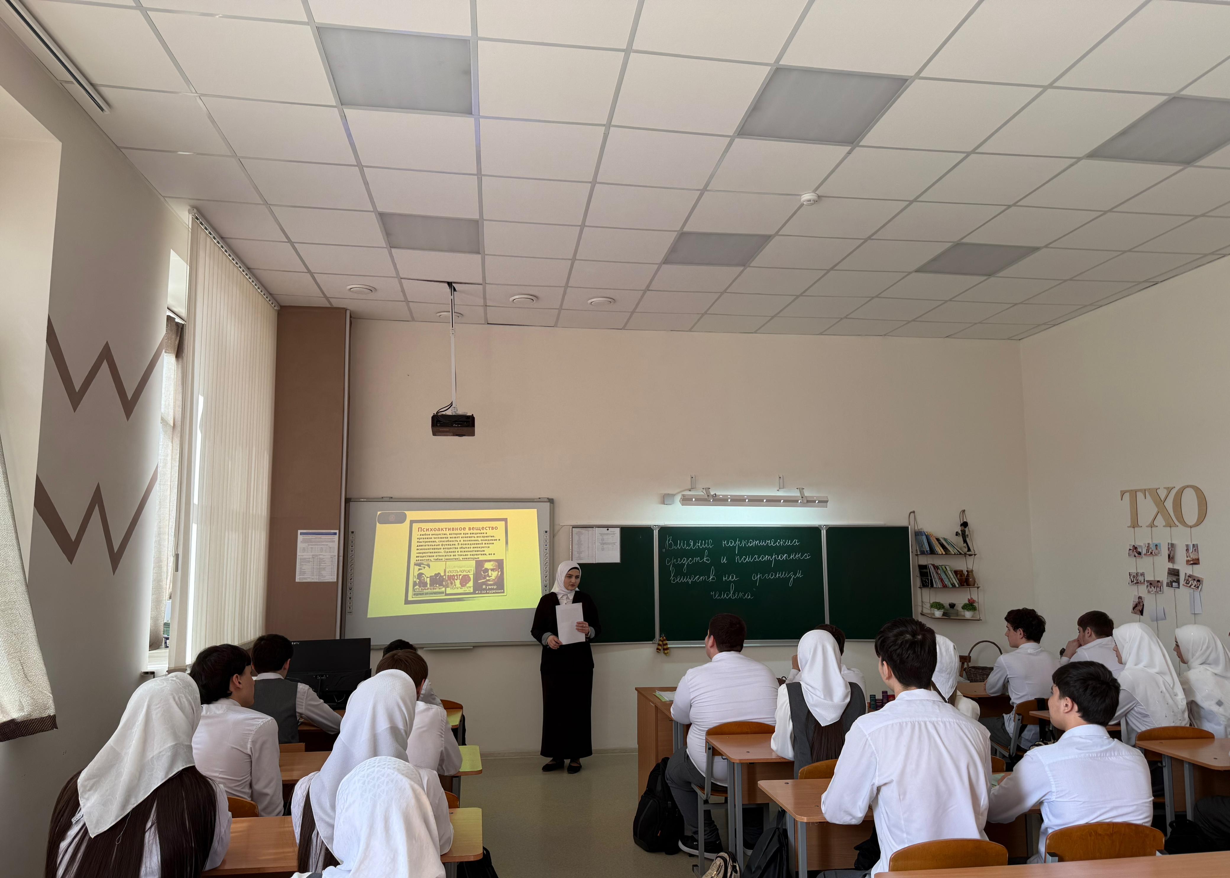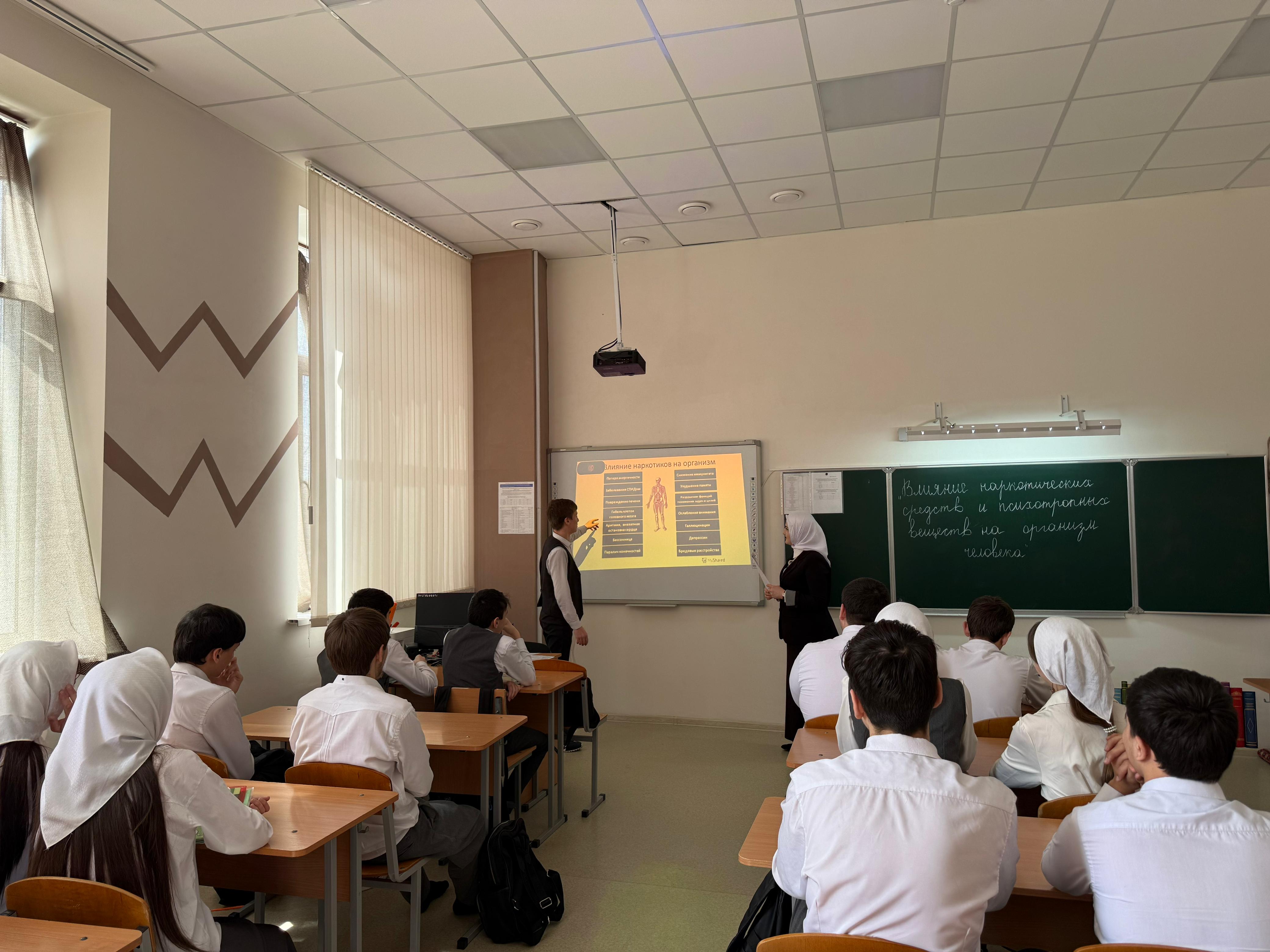 В рамках реализации Единой Концепции духовно-нравственного воспитания и развития подрастающего поколения 29 апреля 2026 года классный руководитель Убаева Р.Х. провела беседу на тему: «Влияние наркотических и психотропных веществ на организм человека». В ходе занятия она объяснила учащимся вред, который наркотики и психотропные вещества наносят организму человека. Убаева Р.Х. также отметила, что наркотики представляют собой огромную опасность не только для тех, кто их употребляет, но и для окружающих, а также для будущих поколений.